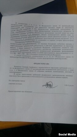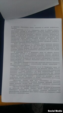В частности, в прокурорском «предостережении о недопустимости нарушения законодательства о противодействии экстремистской деятельности и законодательства о собраниях митингах, демонстрациях, шествиях и пикетированиях» сказано, что организаторы не согласовали проведение митинга с властями Симферополя.