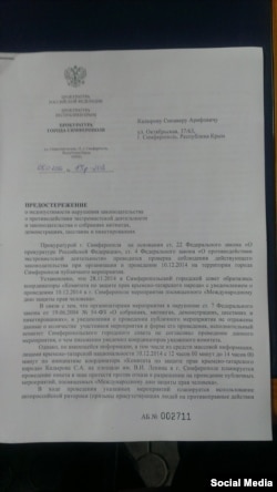 «Прокуратура» и полиция Симферополя вынесли предостережение Комитету по защите прав крымскотатарского народа о недопустимости проведения митинга в Международный день по правам человека 10 декабря.