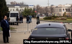 Как передает корреспондент Крым.Реалии, площадь Ленина окружена представителями подразделений ОМОНа, полиции, также была замечена так называемая «самооборона». Особенно большое скопление силовиков у здания Совета министров Крыма.