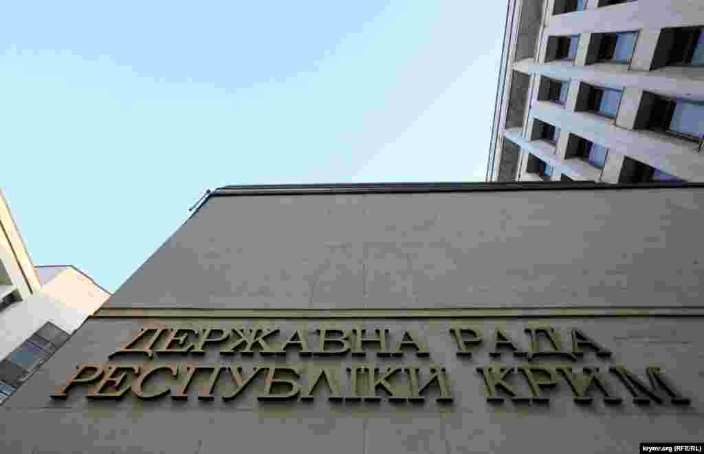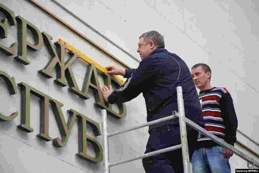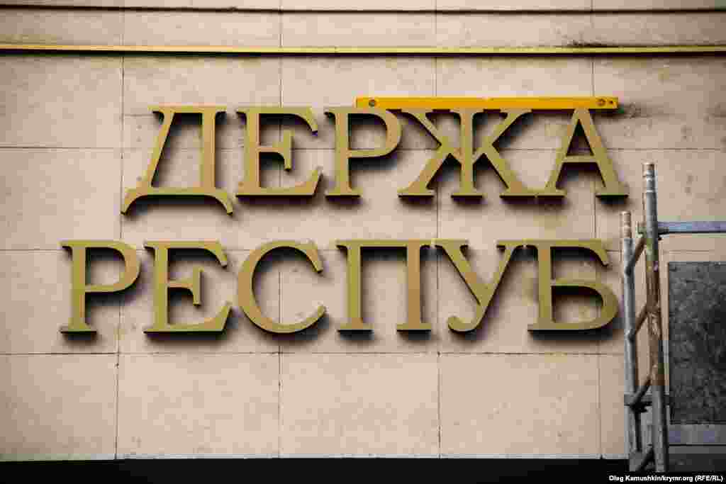 Работники фирмы подрядчика в течении пяти часов крепили буквы «ДЕРЖАВНА РАДА РЕСПУБЛІКИ КРИМ» на фасаде здания «Госсовета». Если завтра будет хорошая погода, обещали прикрепить на крымскотатарском языке. А после заменят буквы в русскоязычном варианте надписи на новые, пообещал сотрудник фирмы.