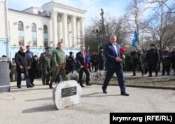 Как передает корреспондент Крым.Реалии, по этому случаю в Симферополе «самообороновцам» вручили награды и медали, а также заложили камень на месте будущего памятника в их честь.