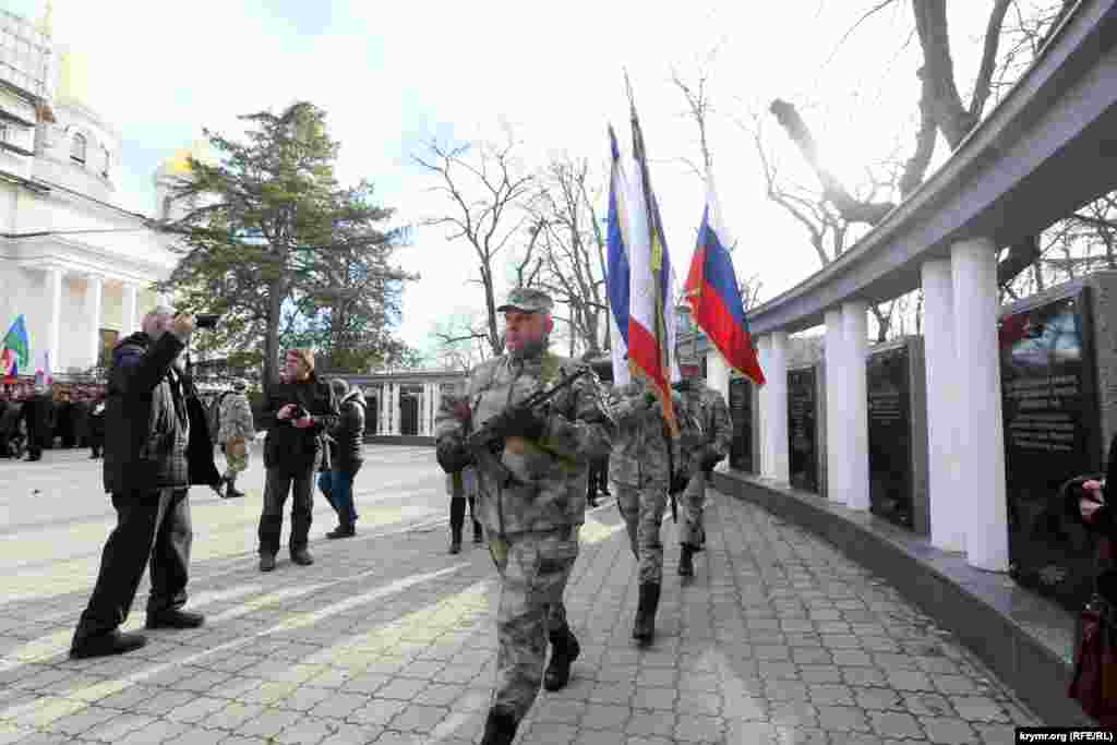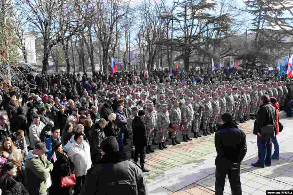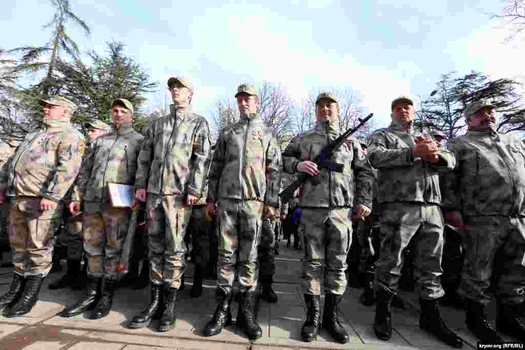 В аннексированном Крыму 23 февраля прошли торжественные мероприятия по случаю первой годовщины создания так называемого народного ополчения – народной дружины Крыма, больше всем известной, как «самооборона». В Симферополе «самообороновцам» вручили награды и медали, а также заложили камень на месте будущего памятника в их честь.