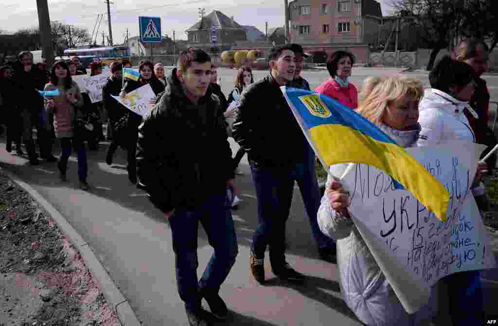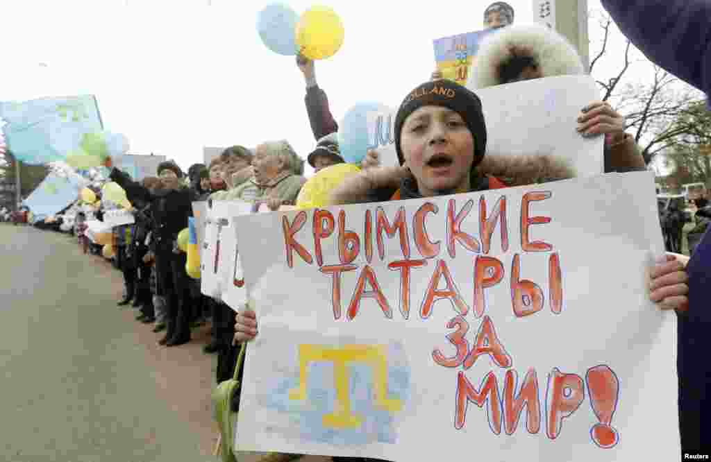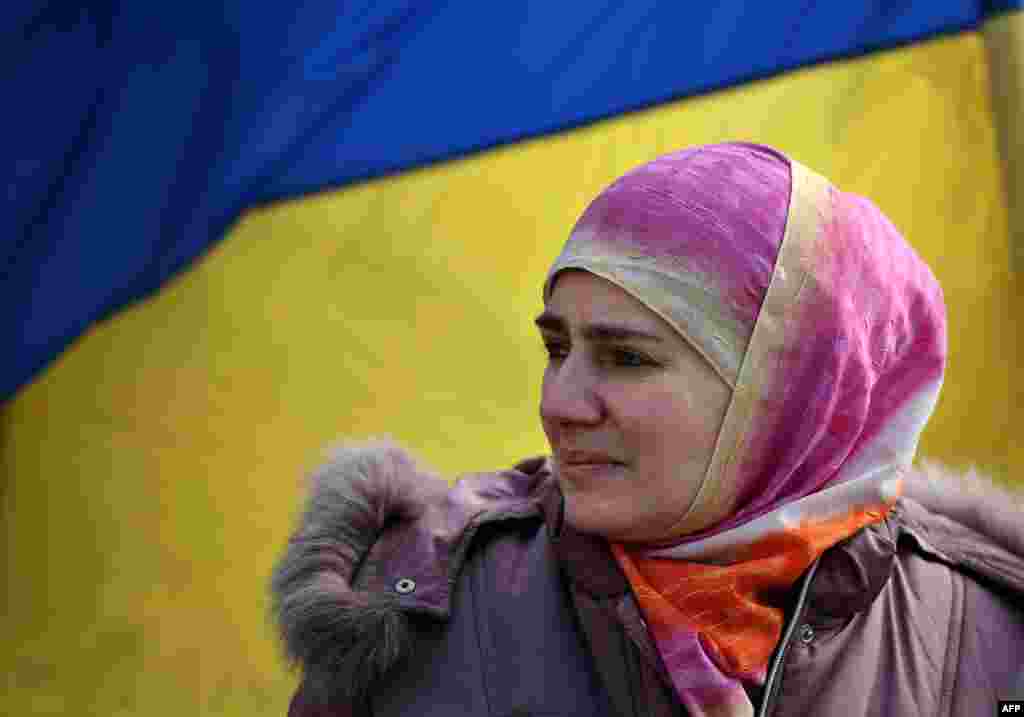 Несколько сотен женщин с крымскотатарского массива Строгановка на окраине Симферополя в четверг провели акцию за мир и против пребывания российских войск в Крыму.