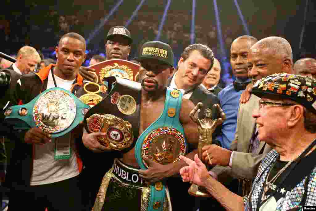 38-летний Мэйуэзер, таким образом, стал обладателем трех титулов чемпиона мира в весовой категории до 66,68 кг - по версиям Всемирной боксерской ассоциации (WBA), Всемирного боксерского совета (WBC) и Всемирной боксерской организации (WBO). Эта победа стала для боксера 48-ой, при этом он не проиграл в своей жизни ни одного боя, а 26 поединков выиграл нокаутом.