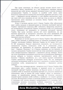 Общественники указали на эти слова главы ГМСУ в своем письме, однако в миграционной службе этот момент проигнорировали. «Каково же было наше удивление, когда замначальника миграционной службы, то есть непосредственный подчиненный чистосердечно признавшегося чиновника, во-первых, полностью опровергает слова своего начальника и указывает на то, что ГМСУ не контактирует с незаконными органами, созданными на временно оккупированных территориях. Во-вторых, указывает на то, что в случае выявления такого контакта их территориальных органов ими «будут предприняты соответствующие меры», ‒ возмущается юрист.