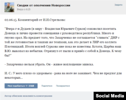 В сообщении Гиркина говорится, что Сурков поссорился с лидером «ДНР» Александром Захарченко, который якобы отказывается «сливать» «ДНР» так же быстро, как это делает лидер сепаратистов в Луганске с так называемой «ЛНР». Однако, Гиркин сообщил, что результаты визита ему неизвестны.