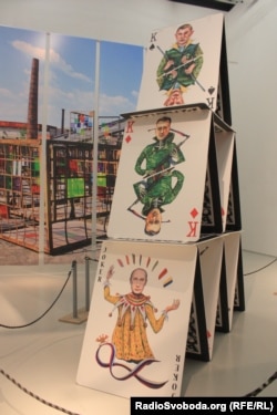 Во время перформанса под названием «Карточный домик» посетителей приглашают сначала рассмотреть огромные игровые карты с карикатурами на пресловутых главарей и боевиков – Александра Захарченко, Игоря Плотницкого, «Моторолу» и других. В основе домика – карта джокера, это российский президент Владимир Путин.