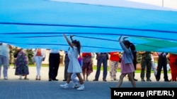 Крымскотатарский флаг размером 10,5 на 7,5 метров был развернут на площади Свободы в Херсоне во время прошедших сегодня торжеств в честь Для крымскотатарского флага.