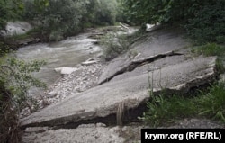 Река Салгир впервые за много лет перестала называться речкой и показала настоящий характер. Сейчас вода ушла, а месяц назад поток выворотил вот эти бетонные плиты, которыми было выложено русло почти пересыхающего обычно в это время года ручья.