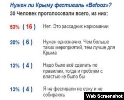 Например, на сайте http://c-pravda.ru/ этот материал подан в виде более приемлемом для социологического опроса. Он имеет «объективный» заголовок: «Нужен ли Крыму фестиваль «Befooz»?», в то время как в газете он представлен в форме безапелляционного утверждения: «Нам «Befooz» не нужен». В то же время сайт полностью разоблачает и несостоятельность опроса – из 2-х с лишним миллионов жителей Крыма на вопрос газеты ответили… всего 30 человек! Более того, данные на сайте и в газете разнятся. Если на сайте в четверг вечером, то есть в момент подписания газеты в печать, и когда ее интернет-вариант уже вывешивается на сайте, и когда интернет-голосование уже должно быть закрытым, а, значит, должно оставаться неизменным и соответствовать тому, которое пошло в газету, он выглядит вот так: