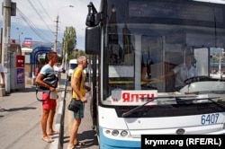 На противоположной стороне трассы на остановке в сторону Симферополя все же собралась небольшая толпа жаждущих уехать. Но первый же подошедший троллейбус забрал всех, так что маршрутке приходится ждать пассажиров.