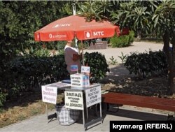 Одна надежда, что это обычные жулики, собирающие деньги «на ремонт Провала». В пользу этого предположения служит реакция на мой смартфон сборщицы-побирушки – резво вскочила и с недовольным бурчанием спряталась в тени. Настоящие «ополченцы» так себя не ведут, слишком хорошо их поведение запомнилось крымчанам весной 2014 года. А вообще пора ироничнее смотреть на подобные сцены – и для здоровья полезнее, и вреда от самозваных «Остапов Бендеров» меньше будет. Мне, например, вот это все кажется готовой инсталляцией из музея современного искусства в каком-нибудь городке Техаса или Оклахомы. Непритязательно и ярко, один зонтик украинского МТС чего стоит! А покорнейшая просьба к ненавистному Западу, а английский, выученный по командам Windows? Если еще научить сборщицу бессмертной фразе Кисы Воробьянинова: «Месье, же не манж па сис жур!», – то это будет уже не инсталляция, а целый перформанс! Причем прошу не считать мои слова глумлением над благородным делом сбора гуманитарной помощи пострадавшим жителям Донбасса, ведь тут даже намеком не сказано, куда пойдут собранные деньги – на макароны пенсионерам Донецка, ополченцам на приборы ночного видения или сборщикам в карман.