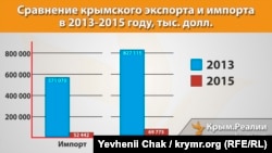 Согласно отчету Крымстата, за январь-сентябрь 2015 года из Крыма было экспортировано товаров на сумму в $ 52 442 000, импортировано - на сумму $ 69 775 000. За аналогичный период 2013 года, когда Крым был украинским не только де-юре, но и де-факто, экспорт продукции с полуострова составил $ 571 070 000, а импорт, соответственно, - $ 827 115 100. Простая арифметика демонстрирует, что показатели по экспорту и импорту снизились в 11 раз.
