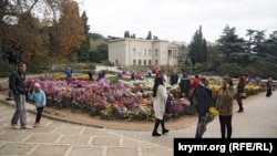 В Никитском саду, несмотря на массовые отключения электричества по Крыму, даже за пару часов до закрытия народу много, припарковались с трудом.