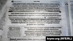 А в продолжение той церемонии вручения на 10-й полосе отдельная статья с заголовком «В администрации города Симферополя состоялось очередное оперативно-хозяйственное совещание под руководством главы городской администрации Геннадия Бахарева». И почти половину статьи составляет перечисление чиновников, которые при этом присутствовали.