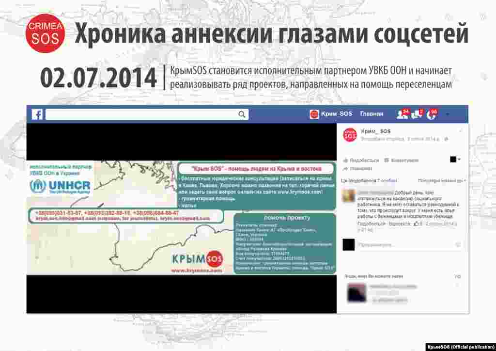 Галерея «хроники» представлена 28 работами – facebook-постами КрымSOS за период с 27 февраля по 2 июля 2014 года. Отобранные по принципу важности и влияния на последующий ход событий, они тем самым воскрешают хронику оккупации Крыма.
