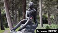Листики, прилепленные на грудь «Купальщицы» кем-то из отдыхающих (сотрудники вряд ли такой цензурой будут заниматься) – четкий индикатор современной культуры России. Это я еще, фотографируя, убрал веточку туи, которую неизвестный ценитель нравственности присобачил изваянию на то самое место.