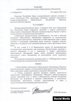 «Цели и действия Меджлиса направлены на осуществление экстремистской деятельности, повлекшей за собой нарушение прав и свобод человека, причинение вреда личности, здоровью граждан, обществу и государству или создающей реальную угрозу причинения такого вреда», – говорится в решении.