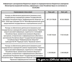 О состоянии информационного фронта крымских пропагандистов можно судить по отчетам министерства внутренней политики, информации и связи подконтрольного России правительства Крыма. В отрытом доступе мы нашли несколько таких документов с цифрами о расходовании бюджетных средств за последние два года и планах на нынешний.