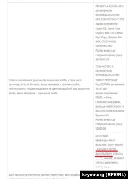 Более интересен перечень владельцев ООО «Карбон проект», зарегистрированного в российском реестре в ноябре 2014 года. Предприятие занимается топографо-геодезической деятельностью, электромонтажными работами, землеустройством, покупкой и продажей земельных участков. Учреждено севастопольским ООО «Стройпроминвест», которым, в свою очередь, владеют Василий Казьмин (возможно, отец арестованного бизнесмена) и принадлежащее ему ООО «Фонд исследований и развития», зарегистрированное в декабре прошлого года на материковой Украине с юридическим адресом в Киеве.