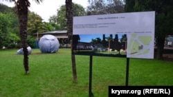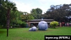 Как сообщает корреспондент Крым.Реалии, в сквере имени Калинина, недалеко от городской набережной, на газоне начали установку световой инсталляции в виде гигантской лампочки накаливания, которую местные жители назвали «памятником блэкауту».