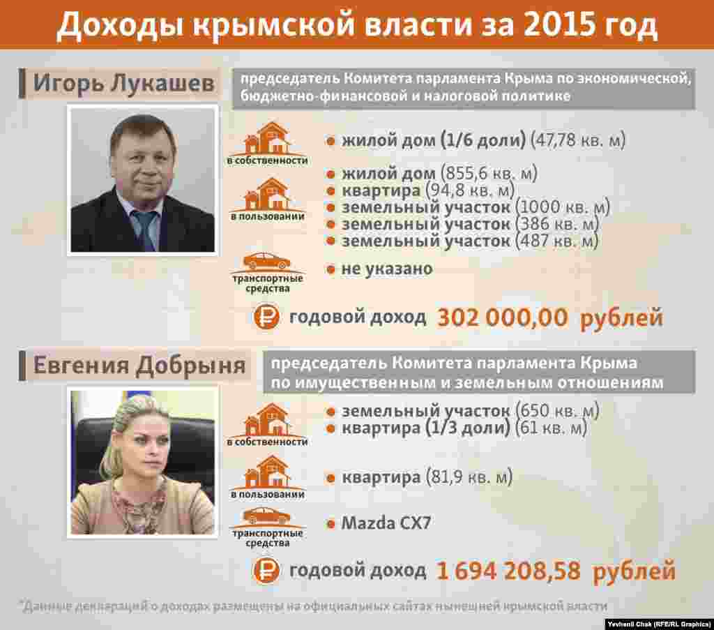 Подконтрольные России крымские власти обнародовали информацию о своих доходах и имуществе за 2015 год. Предлагаем ознакомиться, чем официально владеют крымские чиновники и во сколько они обходятся налогоплательщикам.