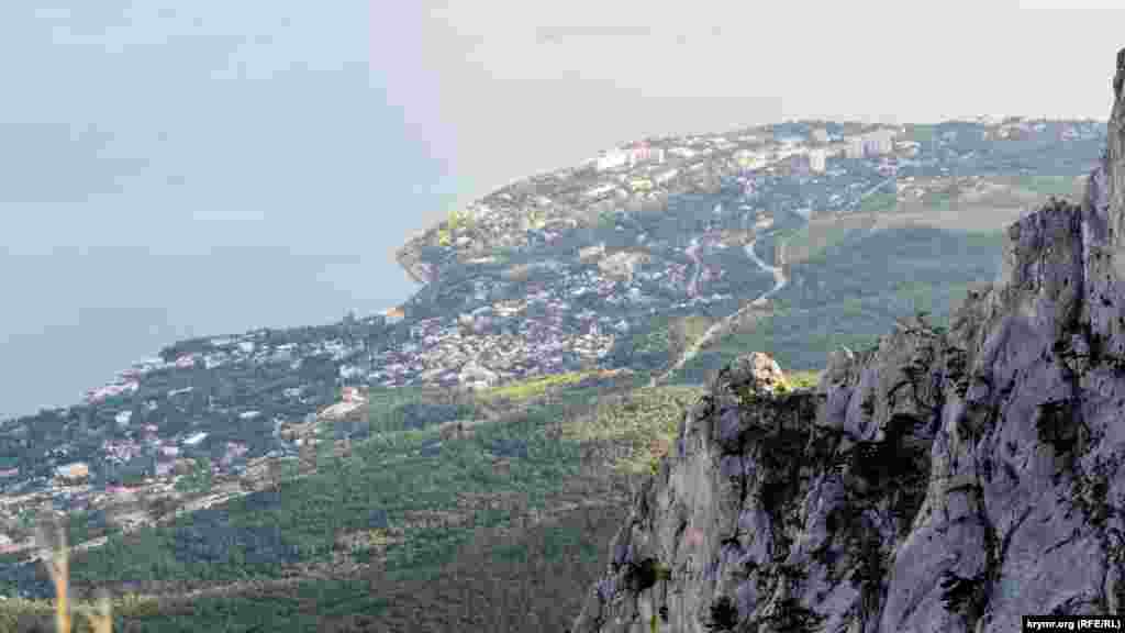 С вершины горы, высота которой 1234 метра, открывается вид на Ай-Петринское плато. Внизу виднеются постройки, в которых размещаются крымскотатарские кафе и рестораны