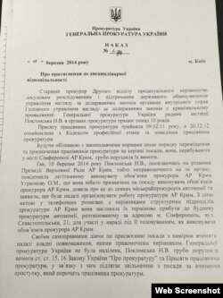 Но, говоря о завершении своей карьеры в Генпрокуратуре Украины, Наталья Поклонская умалчивает о важном факте – она не писала рапорт об увольнении, а была уволена за нарушение присяги украинского прокурора с лишением классного чина «советник юстиции». Крым.Реалии располагают копией соответствующего приказа за подписью и. о. Генпрокурора Украины Олега Махницкого.