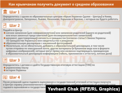 Сейчас действия просты: нужно приехать в один из центров «Крим – це Україна» (в двенадцати ВУЗах Украины), подать документы и заполнить образовательную декларацию, честно рассказав о своих оценках. Остается сдать два предмета – украинский язык и историю Украины (этих предметов нет в Крыму) – и у ребенка уже есть аттестат (пока только справка, сам аттестат получит через некоторое время, но со справкой уже можно сдавать профильный экзамен и зачисляться в ВУЗ). Это все можно сделать за три-пять дней.