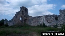 «огромные зазубрины и сломы стен, посреди которых встает одна покосившаяся зубчатая башня. Это – Мангуп-Кале. Сегодня руины не имеют никакого следа древней мощи, однако Мангуп был когда-то городом сильным и богатым, имел свои церкви. Сегодня только одна башня, словно наклоненная от печали, словно окаменевшая смотрит на руины, раз за разом исчезающие с поверхности, чтобы если упасть, то, по крайней мере, последней».