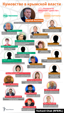 Нынешние крымские власти убеждают, что после «референдума» на полуострове полностью поменялись подходы к укомплектованию властных структур. Практика кумовства и коррупции, «как при Украине», осталась в прошлом, утверждают они. Однако, по подсчетам Крым.Реалии, минимум три десятка госуправленцев и депутатов связаны родственными, партийными и бизнесовыми связями с руководителями аннексированного полуострова.
