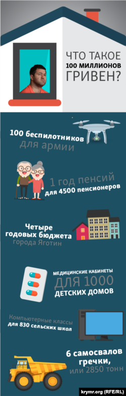 Чтобы понять, насколько значимой может быть сумма в 100 миллионов гривен, ее можно рассчитать в бюджетах города Яготин в Киевской области. Расходы этого 20-тысячного населенного пункта в год ‒ 26 миллионов гривен.
