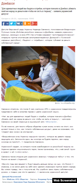 Российские СМИ процитировали якобы заявление народного депутата Украины Надежды Савченко о том, что участники АТО и патриоты возомнили себя героями и цветом нации. Но такого сообщения не было на настоящих страницах Савченко в соцсетях. Это сообщение взяли с фейковой страницы во «Вконтакте».