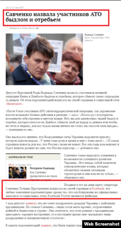 «После 9 мая участники АТО и патриоты возомнили себя героями и цветом нации. Нет, вы для адекватных людей – быдло и отребье, которое поехало на Донбасс убивать свой же народ за деньги или чтобы не сесть в тюрьму, вам чужая жизнь ничего не стоит, вы спасали свои шкуры, вы отдавали свои жизни за олигархов», – якобы заявила на своей странице Савченко».