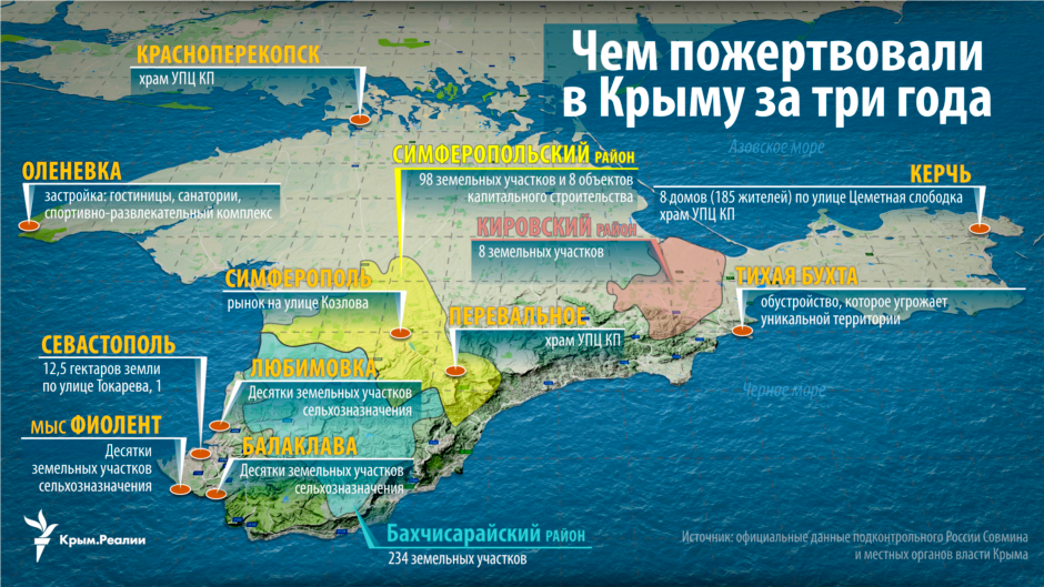 В нашем перечне мы не говорим о крымских заводах и коммерческих предприятиях, которые стали объектами «национализации» и передела собственности. Но обращаем внимание на утраченные земли и собственность рядовых крымчан.