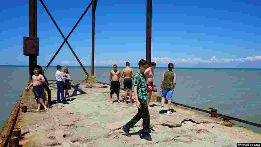На одной из бон Песчаного отчаянные выпускники отважились несколько минут поплавать в море при температуре воды +15
