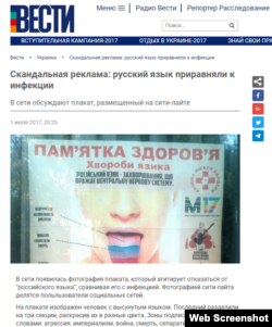 Так, канал Минобороны России со ссылкой на сайт газеты «Вести», выходящей в Украине, отмечает: «На улицах украинской столицы появилась реклама, которая агитирует отказаться от «русского языка», сравнивая его с инфекцией. Снимками, на которых изображены ситилайты со скандальными надписями, делятся пользователи социальных сетей. На плакате представлен человек с высунутым языком, который разделен на три секции и раскрашен в разные цвета. Секции подписаны словами: империализм, агрессия, война, сепаратизм и смерть».