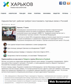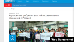 Российская ведущая рассказывает: «Жители Харькова требуют от власти немедленно восстановить экономические связи с Россией. Митинг, на который вышли 500 человек, прошел в понедельник на территории местного завода железобетонных конструкций. Рабочие скандировали: «Дайте нам работу!». Предприятие находится на грани разорения. С подобными требованиями к президенту Порошенко обратились уже более десятка крупных производств страны».