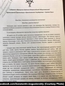 – Писем было два. Письмо, которое я опубликовал [в фейсбуке], было в январе 2017 года, потому что прокат фильма первоначально был назначен на весну. Потом, когда прокат перенесли на более поздний срок, нам пришло второе письмо, это было в июле или в августе, и оно было примерно похожего содержания, только более широкое, на пять листов оно было. В целом суть там такая же.