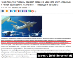 Интересно, что, например, российский пропагандистский сайт «Русская весна» написал, что правительство Украины срывает создание ударного БПЛА «Горлица» и может довести до банкротства завод «Антонов». В тексте «Русской Весны» присутствуют те же цитаты, которые содержались в так называемом «письме», но написано, что якобы об этом заявил президент концерна Александр Кривоконь. А сайт top-n.ru написал, что якобы об этом сообщили «Крым 24» в пресс-службе предприятия.