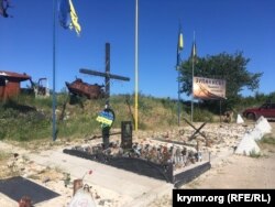 Чистим от травы памятник погибшим недалеко от блокпоста. На флагштоках – знамена частей. За пару месяцев каждое приходит в негодность. Ветер.