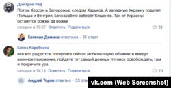 «Потом Херсон и Запорожье, следом Харьков. А западную Украину поделят Польша и Венгрия, Бессарабию заберет Кишенев. Так от Украины останутся рожки да ножки», - пишет пользователь под ником Дмитрий Рэд.