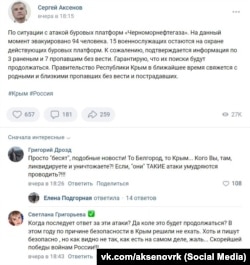 «Сегодня утром враг нанес удар по буровым платформам «Черноморнефтегаза». Нахожусь на связи с коллегами из Минобороны и ФСБ, работаем над спасением людей. Спасены 5 человек, трое из них ранены. Поиски остальных продолжаются», – заявил на своих страницах в соцсетях подконтрольный Кремлю глава Крыма Сергей Аксенов.