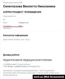 Тогда же журналистка искала работу на сайтах по трудоустройству, указывая, что готова переехать в Киев. Одно из объявлений от ее имени до сих пор сохранилось в открытом доступе.