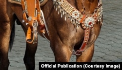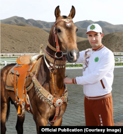 На фотографии нынешнего президента Туркменистана, опубликованной государственными СМИ в апреле 2023 года, Сердар Бердымухамедов держит лошадь в праздничной упряжи на открытии конноспортивного комплекса.