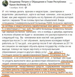 Сотрудники Республиканской детской клинической больницы, получив зарплату за октябрь, недосчитались «кто три, кто пять, а некоторые и семь тысяч рублей», заявил крымчанин Владимир Петрич в группе для обращений к российскому главе Крыма Сергею Аксенову в Facebook.