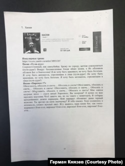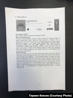 Радио Свобода публикует распечатки с текстами песен популярных молодежных исполнителей, которые раздали членам Экспертного совета при Управлении Федеральной антимонопольной службы России в Нижнем Новгороде – для того, чтобы обсудить необходимость превентивного запрета их концертов.