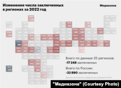 Только для 35 регионов данных оказалось достаточно, чтобы оценить изменение количества заключенных за последний год. Суммарно к началу 2023 года в этих регионах стало на 17 тысяч заключенных меньше (это более половины от сокращения за год в целом по стране).