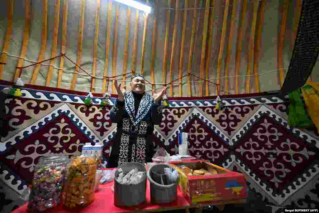 Казах в традиционной одежде стоит внутри юрты рядом с флагами Украины и Казахстана.
