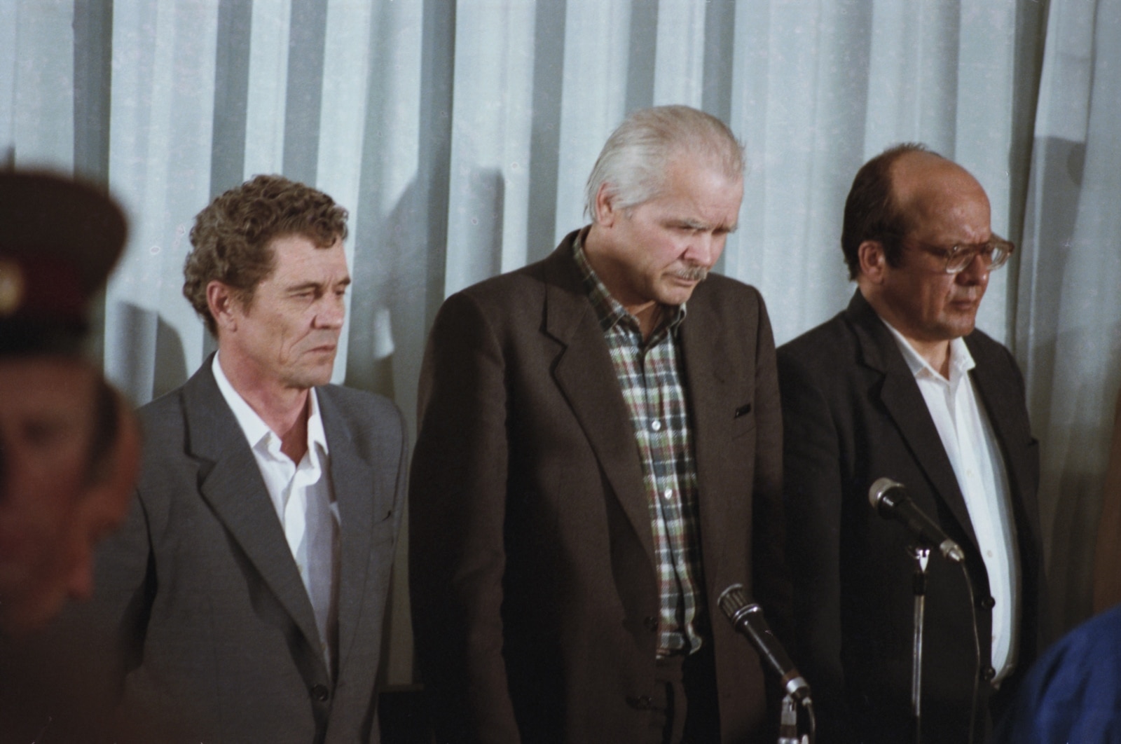 Бывший директор атомной электростанции в Чернобыле Виктор Брюханов, заместитель главного инженера Анатолий Дятлов и главный инженер Николай Фомин во время вынесения приговора на заседании Верховного суда СССР под председательством Раймонда Бризе